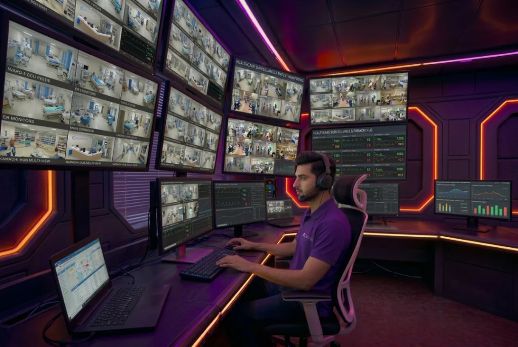 Every healthcare surveillance feed monitored live by a trained operator. Entrance, pharmacy, restricted corridors, operation theatre areas — a real professional watching, not footage stored for review later.